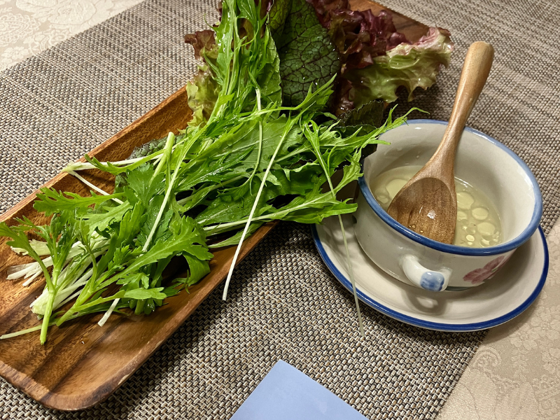 私のお話し会対面開催では、自家製鉄ミネラル栽培の野菜をつまみながらのことが多く、今回も始まる前に、庭から採ってきたサラダ菜や水菜などを用意しました。