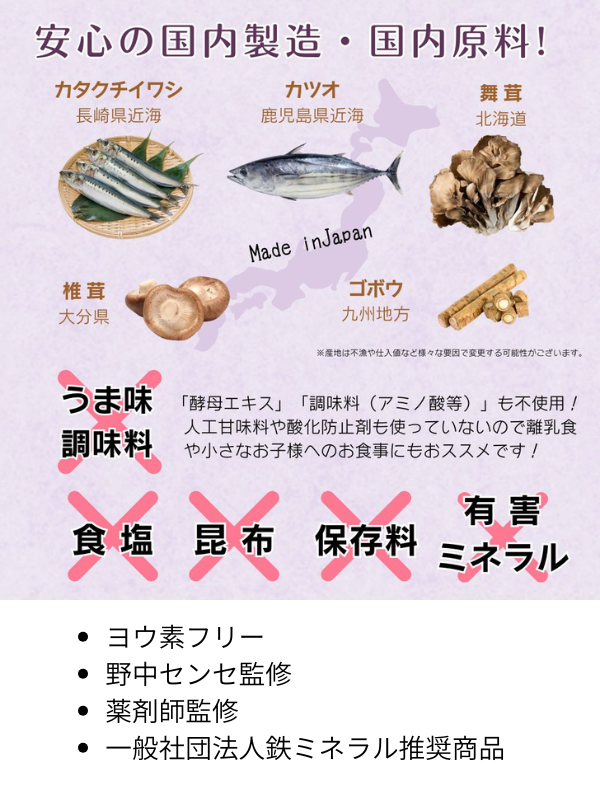 スープとしても、出汁としても使いやすいパウダー状。毎日忙しいお母さんの食事作りに、お助け食材です。